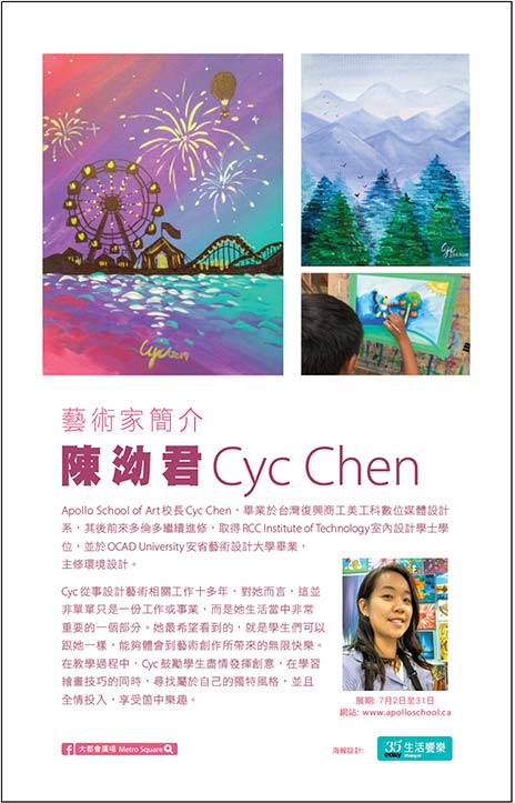 Apollo School of Art校長Cyc Chen,畢業於台灣復興商工美工科數位媒體設計系,其後前來多倫多繼續進修,取得RCC Institute of Technology室內設計學士學位,並於OCAD University安省藝術設計大學畢業,主修環境設計。