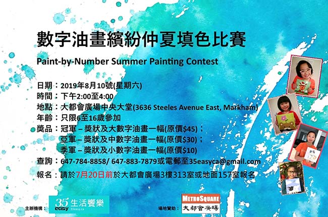 數字油畫彩繪,簡易好玩,只需跟隨畫布上的數字填上指定顏色,就可以輕鬆地完成一幅漂亮的藝術作品!《數字油畫繽紛仲夏填色比賽》即將於大都會廣場舉行,每位參賽的小朋友將免費獲派發一張20cm x 20cm的數字油畫(原價$10)及所需的顏料與畫筆,並須於指定的2小時內完成填色彩繪。比賽結束後,冠、亞、季軍固然會獲贈豐富獎品,其他參賽者也可以把自己的參賽作品帶回家,無論作為美化家居的擺設或是用來送給長輩親友,都特別有意義!名額有限,請即報名參加!