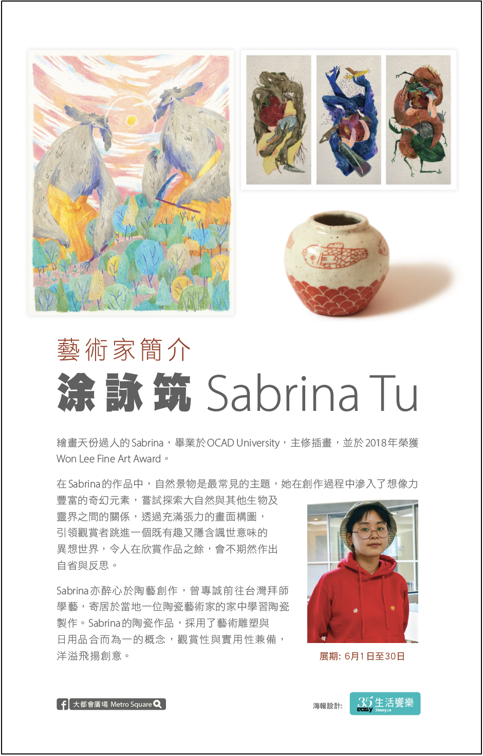 大都會活動 《創意飛揚》藝術家Sabrina Tu作品展 Sabrina畢業於 OCAD University,主修插畫,並於2018年榮獲Won Lee Fine Art Award。在 Sabrina 的作品中,自然景物是最常見的主題,她在創作… Read More » 2019-06-06